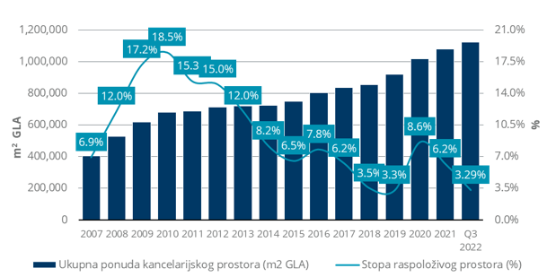 Međutim, oporavak tržišta tokom 2021. godine, koje je nastavljen i tokom 2022. godine, utiče na smanjenje stope slobodnog prostora, koja na kraju Q3 2022 ponovo dostiže istorijski minimum. Na stabilnim, razvijenim tržištima, stopa raspoloživog prostora se kreće između 5-10%, te se stopa oko 3-4% smatra niskom i najčešće je signal investitorima da nastave sa izgradnjom.